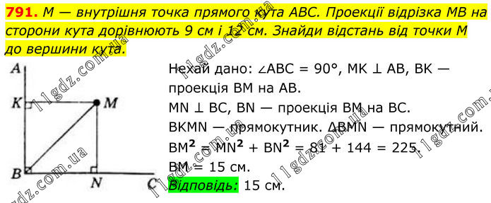 791. M — внутрішня точка прямого кута ABC. Проекції відрізка MB на сторони кута дорівнюють 9 см і 12 см. Знайди відстань від точки M до вершини кута. Нехай дано: ∠ABC = 90°, MK ⊥ AB, BK — проекція BM на AB. MN ⊥ BC, BN — проекція BM на BC. BKMN — прямокутник. ∆BMN — прямокутний. BM2 = MN2 + BN2 = 81 + 144 = 225. BM = 15 см. Відповідь: 15 см.