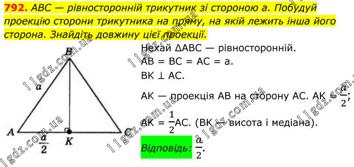 792. ABC — рівносторонній трикутник зі стороною a. Побудуй проекцію сторони трикутника на пряму, на якій лежить інша його сторона. Знайдіть довжину цієї проекції. Нехай ∆АВС — рівносторонній. AB = BC = AC = а. BK ⊥ AC. AK — проекція AB на сторону AC. AK = a/2; AK = 1/2АС. (BK — висота і медіана). Відповідь: a/2.