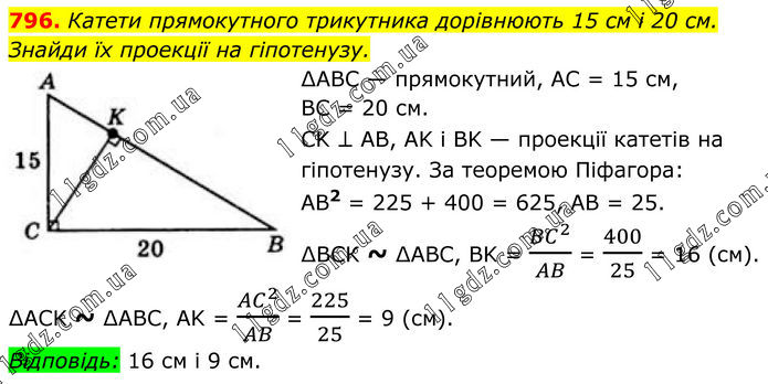 796. Катети прямокутного трикутника дорівнюють 15 см і 20 см. Знайди їх проекції на гіпотенузу. ∆ABC — прямокутний, AC = 15 см, BC = 20 см. CK ⊥ AB, AK і BK — проекції катетів на гіпотенузу. За теоремою Піфагора: AB2 = 225 + 400 = 625, АВ = 25. ∆ВСК ~ ∆ABC, BK = 〖BC〗^2/AB = 400/25 = 16 (см). ∆ACK ~ ∆ABC, AK = 〖AC〗^2/AB = 225/25 = 9 (см). Відповідь: 16 см і 9 см.