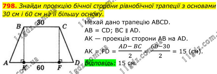798. Знайди проекцію бічної сторони рівнобічної трапеції з основами 30 см і 60 см на її більшу основу. Нехай дано трапецію ABCD. AB = CD; BC ∥ AD. AK — проекція сторони AB на AD. AK = FD = (AD- BC)/2 = (60-30)/2 = 15 (см). Відповідь: 15 см.