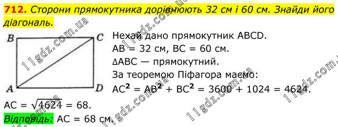 712. Сторони прямокутника дорівнюють 32 см і 60 см. Знайди його діагональ. Нехай дано прямокутник ABCD. AB = 32 см, BC = 60 см. ∆ABC — прямокутний. За теоремою Піфагора маємо: AC2 = AB2 + BC2 = 3600 + 1024 = 4624. AC = √4624 = 68. Відповідь: AC = 68 см.