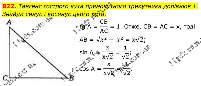 822. Тангенс гострого кута прямокутного трикутника дорівнює 1. Знайди синус і косинус цього кута. tg A = CB/AC = 1. Отже, CB = AC = x, тоді AB = √(x^2+ x^2 ) = x√2; sin A = x/(x√2) = 1/√2; cos A = x/(x√2) = 1/√2.