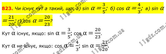 823. Чи існує кут а такий, що: а) sin α = 3/5; б) cos α = 4/3; в) sin α = 21/20; г) cos α = 20/23? Кут α існує, якщо: sin α = 3/5; cos α = 20/23. Кут α не існує, якщо: cos α = 4/3; sin α = 21/20.