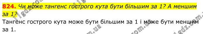 824. Чи може тангенс гострого кута бути більшим за 1? А меншим за 1? Тангенс гострого кута може бути більшим за 1 і може бути меншим за 1.