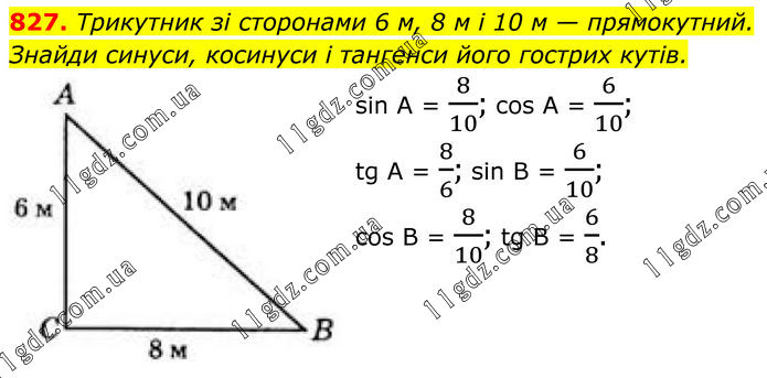 827. Трикутник зі сторонами 6 м, 8 м і 10 м — прямокутний. Знайди синуси, косинуси і тангенси його гострих кутів. sin A = 8/10; cos A = 6/10; tg A = 8/6; sin B = 6/10; cos B = 8/10; tg B = 6/8.