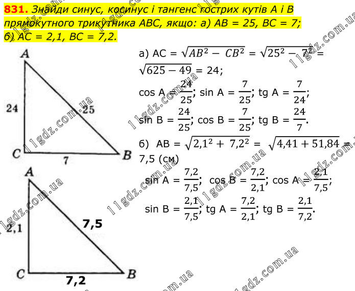 831. Знайди синус, косинус і тангенс гострих кутів А і В прямокутного трикутника ABC, якщо: a) AB = 25, BC = 7; б) AC = 2,1, BC = 7,2. a) AC = √(〖AB〗^2- 〖CB〗^2 ) = √(25^2- 7^2 ) = √(625-49) = 24; cos A = 24/25; sin A = 7/25; tg A = 7/24; sin B = 24/25; cos B = 7/25; tg B = 24/7. б) AB = √(〖2,1〗^2+ 〖7,2〗^2 ) = √(4,41+51,84) = 7,5 (см); sin A = 7,2/7,5; cos B = 7,2/2,1; cos A = 2,1/7,5; sin B = 2,1/7,5; tg A = 7,2/2,1; tg B = 2,1/7,2.