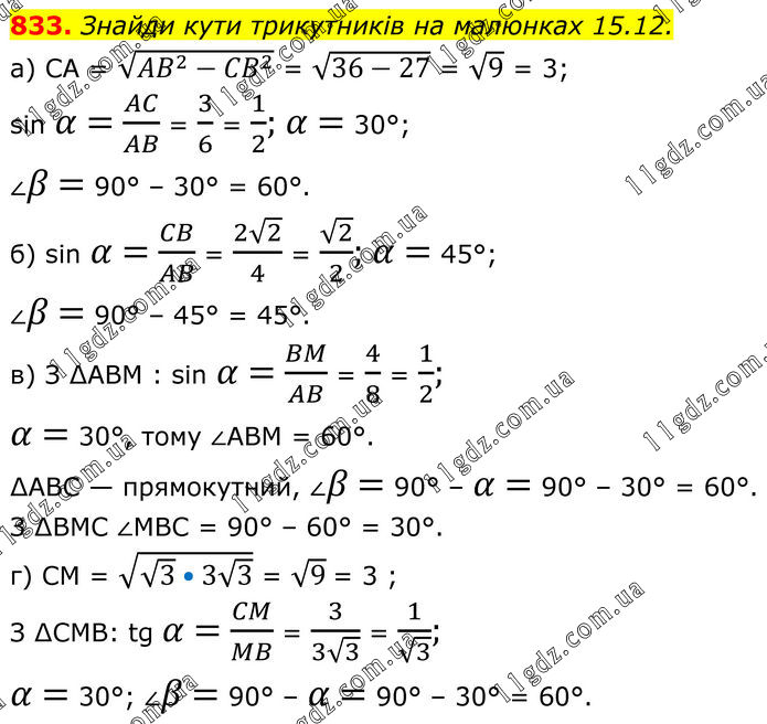 833. Знайди кути трикутників на малюнках 15.12. а) CA = √(〖AB〗^2-〖CB〗^2 ) = √(36-27) = √9 = 3; sin α = AC/AB = 3/6 = 1/2; α = 30°; ∠β = 90° – 30° = 60°. б) sin α = CB/AB = (2√2)/4 = √2/2; α = 45°; ∠β = 90° – 45° = 45°. в) З ∆АВМ : sin α = BM/AB = 4/8 = 1/2; α = 30°, тому ∠ABM = 60°. ∆ABC — прямокутний, ∠β = 90° – α = 90° – 30° = 60°. З ∆ВМС ∠MBC = 90° – 60° = 30°. г) CM = √(√3•3√3) = √9 = 3; З ∆CMB: tg α = CM/MB = 3/(3√3) = 1/√3; α = 30°; ∠β = 90° – α = 90° – 30° = 60°.
