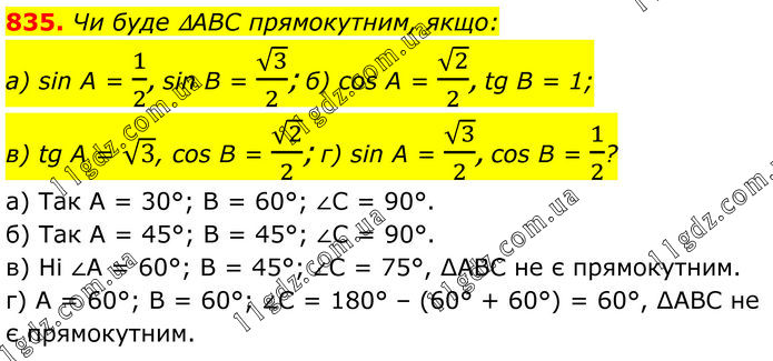 835. Чи буде ∆ABC прямокутним, якщо: a) sin A = 1/2, sin В = √3/2; б) cos А = √2/2, tg В = 1; в) tg А = √3, cos В = √2/2; г) sin А = √3/2, cos В = 1/2? а) Так А = 30°; В = 60°; ∠C = 90°. б) Так А = 45°; В = 45°; ∠C = 90°. в) Ні ∠А = 60°; В = 45°; ∠C = 75°, ∆АВС не є прямокутним. г) А = 60°; B = 60°; ∠C = 180° – (60° + 60°) = 60°, ∆АВС не є прямокутним.