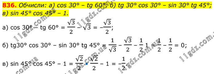 836. Обчисли: a) cos 30° – tg 60°; б) tg 30° cos 30° – sin 30° tg 45°; в) sin 45° cos 45° – 1. a) cos 30° – tg 60° = √3/2 – √3 = –√3/2; б) tg30° cos 30° – sin 30° tg 45° = 1/√3 – √3/2 – 1/2 1 = 1/2 – 1/2 = 0; в) sin 45° cos 45° – 1 = √2/2 • √2/2 – 1 = –1/2.