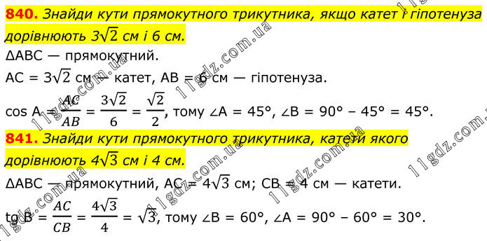 840. Знайди кути прямокутного трикутника, якщо катет і гіпотенуза дорівнюють 3√2 см і 6 см. ∆ABC — прямокутний. AC = З√2 см — катет, AB = 6 см — гіпотенуза. cos А = AC/AB = (3√2)/6 = √2/2, тому ∠A = 45°, ∠B = 90° – 45° = 45°. 841. Знайди кути прямокутного трикутника, катети якого дорівнюють 4√3 см і 4 см. ∆ABC — прямокутний, AC = 4√3 см; CB = 4 см — катети. tg B = AC/CB = (4√3)/4 = √3, тому ∠B = 60°, ∠A = 90° – 60° = 30°.