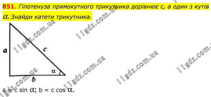 851. Гіпотенуза прямокутного трикутника дорівнює с, а один з кутів α. Знайди катети трикутника. a = c sin α; b = c cos α.