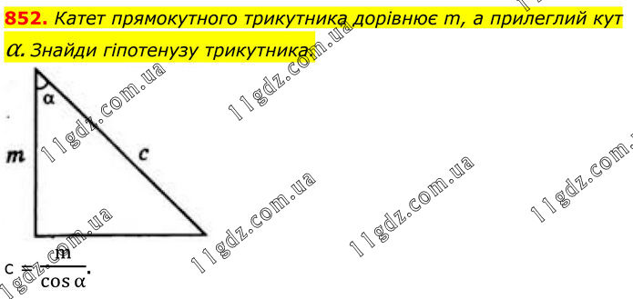 852. Катет прямокутного трикутника дорівнює m, а прилеглий кут α. Знайди гіпотенузу трикутника. c = m/cosα .