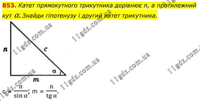 853. Катет прямокутного трикутника дорівнює n, а протилежний кут α. Знайди гіпотенузу і другий катет трикутника. c = n/sinα ; m = n/tgα .