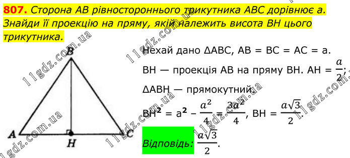 807. Сторона AB рівностороннього трикутника ABC дорівнює a. Знайди її проекцію на пряму, якій належить висота BH цього трикутника. Нехай дано ∆ABC, AB = BC = AC = а. BH — проекція AB на пряму BH. AH = a/2; ∆ABH — прямокутний. BH2 = а2 – a^2/4 = 〖3a〗^2/4, BH = (a√3)/2. Відповідь: (a√3)/2.