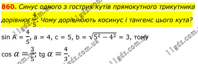 860. Синус одного з гострих кутів прямокутного трикутника дорівнює 4/5. Чому дорівнюють косинус і тангенс цього кута? sin A = 4/5, а = 4, с = 5, b = √(5^2-4^2 ) = 3, тому соs α = 3/5; tg α = 4/3.