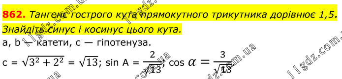 862. Тангенс гострого кута прямокутного трикутника дорівнює 1,5. Знайдіть синус і косинус цього кута. а, b — катети, с — гіпотенуза. с = √(3^2+2^2 ) = √13; sin A = 2/√13; cos α = 3/√13.