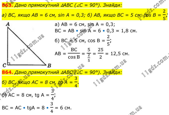 863. Дано прямокутний ∆ABC (∠C = 90°). Знайди: а) BC, якщо AB = 6 см, sin А = 0,3; б) AB, якщо BC = 5 см, cos В = 2/5; a) AB = 6 cм, sin A = 0,3; BC = AB • sin A = 6 • 0,3 = 1,8 cм. б) BC = 5 cм, cos B = 2/5; AB = BC/cosB = 5/(2/5) = 25/2 = 12,5 см. 864. Дано прямокутний ∆ABC (∠C = 90°). Знайди: б) BC, якщо AC = 8 см, tg А = 3/4. б) AC = 8 cм, tg A = 3/4; BC = AC • tgA = 8 • 3/4 = 6 cм.