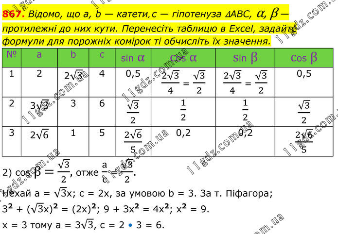 867. Відомо, що а, b — катети, с — гіпотенуза ∆ABC, α, β — протилежні до них кути. Перенесіть таблицю в Exсel, задайте формули для порожніх комірок ті обчисліть їх значення. № a b c sin α cos α sin β cos β 1 2 2√3 4 0,5 (2√3)/4 = √3/2 (2√3)/4 = √3/2 0,5 2 3√3 3 6 √3/2 1/2 1/2 √3/2 3 2√6 1 5 (2√6)/5 0,2 0,2 (2√6)/5 2) cos β = √3/2, отже a/c = √3/2. Нехай a = √3x; c = 2x, за умовою b = 3. За т. Піфагора; З2 + (√3x)2 = (2х)2; 9 + Зх2 = 4x2; x2 = 9. х = 3 тому а = 3√3, с = 2 • 3 = 6.