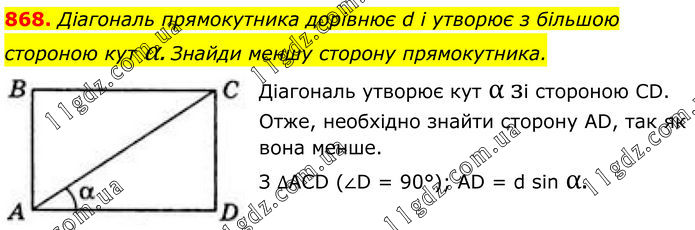 868. Діагональ прямокутника дорівнює d і утворює з більшою стороною кут α. Знайди меншу сторону прямокутника. Діагональ утворює кут α зі стороною CD. Отже, необхідно знайти сторону AD, так як вона менше. З ∆ACD (∠D = 90°); AD = d sin α.