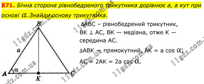 871. Бічна сторона рівнобедреного трикутника дорівнює а, а кут при основі α. Знайди основу трикутника. ∆ABC – рівнобедрений трикутник, BK ⊥ AC, BK — медіана, отже K — середина AC. ∆ABK — прямокутний, AK = a cos α; AC = 2AK = 2а cos α.