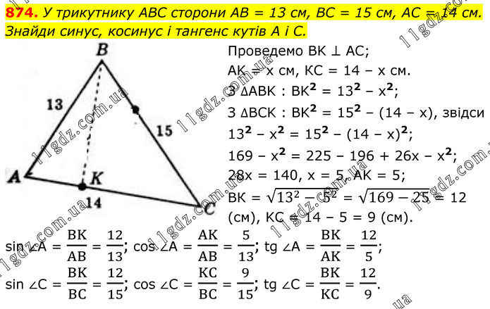874. У трикутнику АВС сторони АВ = 13 см, ВС = 15 см, АС = 14 см. Знайди синус, косинус і тангенс кутів А і С. Проведемо BK ⊥ AC; AK = х см, КС = 14 – х см. З ∆ABK : BK2 = 132 – x2; З ∆BCK : BK2 = 152 – (14 – х), звідси 132 – x2 = 152 – (14 – х)2; 169 – х2 = 225 – 196 + 26х – х2; 28х = 140, х = 5, AK = 5; ВК = √(13^2- 5^2 ) = √(169-25) = 12 (см), KC = 14 – 5 = 9 (см). sin ∠A = BK/AB = 12/13; cos ∠A = AK/AB = 5/13; tg ∠A = BK/AK = 12/5; sin ∠C = BK/BC = 12/15; cos ∠C = KC/BC = 9/15; tg ∠C = BK/KC = 12/9.