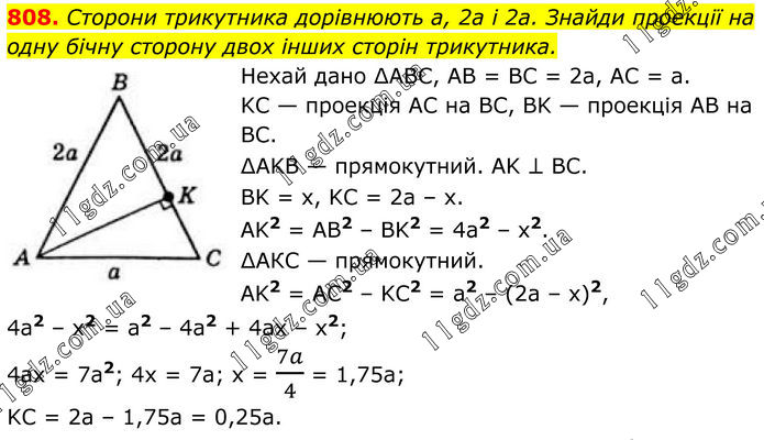 808. Сторони трикутника дорівнюють a, 2a і 2a. Знайди проекції на одну бічну сторону двох інших сторін трикутника. Нехай дано ∆ABC, AB = BC = 2а, AC = а. KC — проекція AC на BC, BK — проекція AB на BC. ∆AKB — прямокутний. AK ⊥ BC. BK = x, KC = 2а – х. AK2 = AB2 – BK2 = 4a2 – x2. ∆АКС — прямокутний. AK2 = AC2 – KC2 = а2 – (2а – х)2, 4а2 – x2 = а2 – 4а2 + 4ах – х2; 4ах = 7a2; 4х = 7а; x = 7a/4 = 1,75а; KC = 2а – 1,75а = 0,25а.