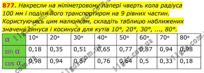 877. Накресли на міліметровому папері чверть кола радіуса 100 мм і поділи його транспортиром на 9 рівних частин. Користуючись цим малюнком, складіть таблицю наближених значень синуса і косинуса для кутів 10°, 20°, 30°, ..., 80°. α 10° 20° 30° 40° 50° 60° 70° 80° sin α 0,18 0,35 0,51 0,65 0,77 0,87 0,94 0,98 cos α 0,98 0,94 0,87 0,76 0,64 0,5 0,33 0,18