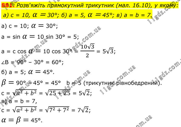 881. Розв’яжіть прямокутний трикутник (мал. 16.10), у якому: а) с = 10, α = 30°; б) а = 5, α = 45°; в) а = b = 7. а) с = 10; α = 30°; а = sin α = 10 sin 30° = 5; а = с cos α = 10 cos 30° = (10√3)/2 = 5√3; ∠B = 90° – 30° = 60°; б) a = 5; α = 45°. β = 90° – 45° = 45°, b = 5 (трикутник рівнобедрений). c = √(a^2+b^2 ) = √(25+25) = 5√2; в) а = b = 7, c = √(a^2+b^2 ) = √(7^2+7^2 ) = 7√2; α = β = 45°.