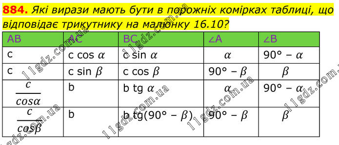 884. Які вирази мають бути в порожніх комірках таблиці, що відповідає трикутнику на малюнку 16.10? AB AC BC ∠A ∠B c c cos α c sin α α 90° – α c c sin β c cos β 90° – β β c/cosα b b tg α α 90° – α c/cosβ b b tg(90° – β) 90° – β β