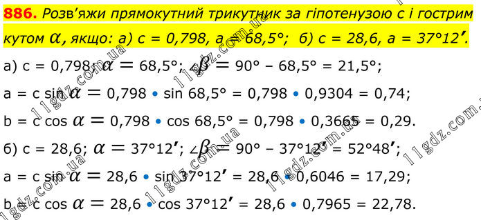 886. Розв’яжи прямокутний трикутник за гіпотенузою с і гострим кутом α, якщо: а) с = 0,798, а = 68,5°; б) с = 28,6, а = 37°12’. а) c = 0,798; α = 68,5°; ∠β = 90° – 68,5° = 21,5°; а = с sin α = 0,798 • sin 68,5° = 0,798 • 0,9304 = 0,74; b = с cos α = 0,798 • cos 68,5° = 0,798 • 0,3665 = 0,29. б) c = 28,6; α = 37°12’; ∠β = 90° – 37°12’ = 52°48’; а = c sin α = 28,6 • sin 37°12’ = 28,6 • 0,6046 = 17,29; b = c cos α = 28,6 • cos 37°12’ = 28,6 • 0,7965 = 22,78.