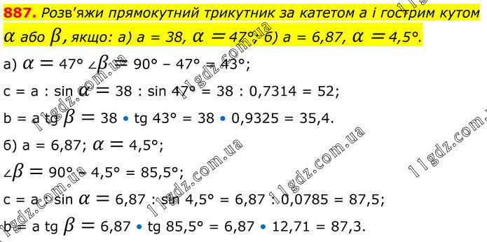 887. Розв’яжи прямокутний трикутник за катетом а і гострим кутом α або β, якщо: a) a = 38, α = 47°; б) а = 6,87, α = 4,5°. a) α = 47° ∠β = 90° – 47° = 43°; c = а : sin α = 38 : sin 47° = 38 : 0,7314 = 52; b = a tg β = 38 • tg 43° = 38 • 0,9325 = 35,4. б) a = 6,87; α = 4,5°; ∠β = 90° – 4,5° = 85,5°; c = a : sin α = 6,87 : sin 4,5° = 6,87 : 0,0785 = 87,5; b = a tg β = 6,87 • tg 85,5° = 6,87 • 12,71 = 87,3.