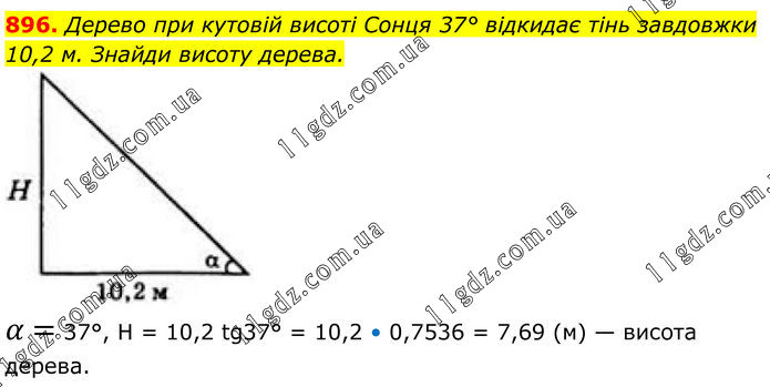 896. Дерево при кутовій висоті Сонця 37° відкидає тінь завдовжки 10,2 м. Знайди висоту дерева. α = 37°, H = 10,2 tg37° = 10,2 • 0,7536 = 7,69 (м) — висота дерева.