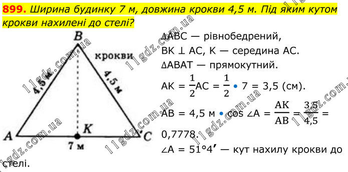 899. Ширина будинку 7 м, довжина крокви 4,5 м. Під яким кутом крокви нахилені до стелі? ∆ABC — рівнобедрений, BK ⊥ AC, K — середина AC. ∆ABAT — прямокутний. AK = 1/2АС = 1/2 • 7 = 3,5 (см). AB = 4,5 м • cos ∠А = AK/AB = 3,5/4,5 = 0,7778. ∠A = 51°4’ — кут нахилу крокви до стелі.