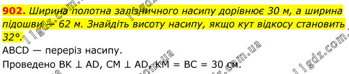 902. Ширина полотна залізничного насипу дорівнює 30 м, а ширина підошви — 62 м. Знайдіть висоту насипу, якщо кут відкосу становить 32°. ABCD — переріз насипу. Проведено BK ⊥ AD, CM ⊥ AD, KM = BC = 30 см.