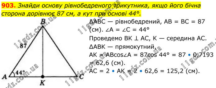 903. Знайди основу рівнобедреного трикутника, якщо його бічна сторона дорівнює 87 см, а кут при основі 44°. ∆ABC — рівнобедрений, AB = BC = 87 (cм). ∠A = ∠C = 44°. Проведемо BK ⊥ AC, K — середина AC. ∆ABK — прямокутний, AK = ABcos∠А = 87cos 44° = 87 • 0,7193 = 62,6 (см). AC = 2 • AK = 2 • 62,6 = 125,2 (см).