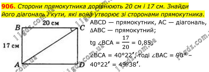 906. Сторони прямокутника дорівнюють 20 см і 17 см. Знайди його діагональ і кути, які вона утворює зі сторонами прямокутника. ABCD — прямокутник, AC — діагональ, ∆АВС — прямокутний; tg ∠BCA = 17/20 = 0,85; ∠BCA = 40°22’, тоді ∠ВАС = 90° – 40°22’ = 49°38’.
