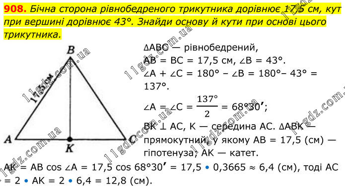 908. Бічна сторона рівнобедреного трикутника дорівнює 17,5 см, кут при вершині дорівнює 43°. Знайди основу й кути при основі цього трикутника. ∆ABC — рівнобедрений, AB = BC = 17,5 см, ∠B = 43°. ∠А + ∠C = 180° – ∠В = 180°– 43° = 137°. ∠A = ∠C = (137°)/2 = 68°30’; ВK ⊥ AC, K — середина AC. ∆ABK — прямокутний, у якому AB = 17,5 (см) — гіпотенуза; AK — катет. АK = AB cos ∠А = 17,5 cos 68°30’ = 17,5 • 0,3665 ≈ 6,4 (см), тоді AC = 2 • AK = 2 • 6,4 = 12,8 (см).