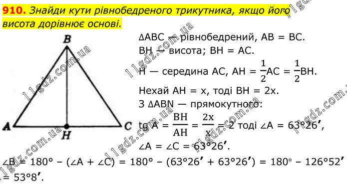 910. Знайди кути рівнобедреного трикутника, якщо його висота дорівнює основі. ∆АВС — рівнобедрений, AB = BC. BH — висота; BH = AC. H — середина AC, AH = 1/2АС = 1/2ВН. Нехай AH = х, тоді BH = 2х. З ∆ABN — прямокутного: tg A = BH/AH = 2x/x = 2 тоді ∠A = 63°26’, ∠A = ∠C = 63°26’. ∠В = 180° – (∠А + ∠С) = 180° – (6З°26’ + 63°26’) = 180° – 126°52’ = 53°8’.