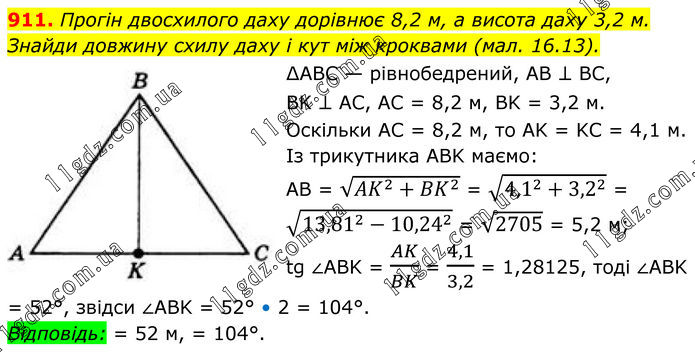 911. Прогін двосхилого даху дорівнює 8,2 м, а висота даху 3,2 м. Знайди довжину схилу даху і кут між кроквами (мал. 16.13). ∆АВС — рівнобедрений, AB ⊥ BC, BK ⊥ AC, AC = 8,2 м, BK = 3,2 м. Оскільки AC = 8,2 м, то AK = KC = 4,1 м. Із трикутника ABK маємо: AB = √(〖AK〗^2+〖BK〗^2 ) = √(〖4,1〗^2+〖3,2〗^2 ) = √(〖13,81〗^2-〖10,24〗^2 ) = √2705 = 5,2 м; tg ∠ABK = AK/BK = 4,1/3,2 = 1,28125, тоді ∠ABK = 52°, звідси ∠ABK = 52° • 2 = 104°. Відповідь: = 52 м, = 104°.