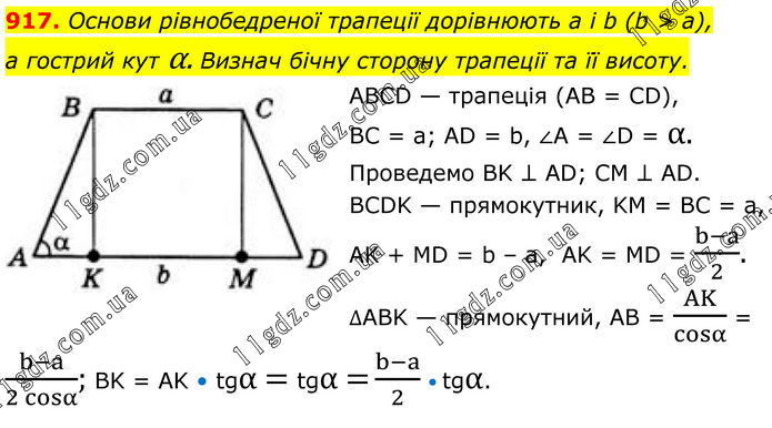 917. Основи рівнобедреної трапеції дорівнюють а і b (b > а), а гострий кут α. Визнач бічну сторону трапеції та її висоту. ABCD — трапеція (AB = CD), BC = а; AD = b, ∠A = ∠D = α. Проведемо BK ⊥ AD; CM ⊥ AD. BCDK — прямокутник, KM = BC = а, AK + MD = b – a, AK = MD = (b-a)/2. ∆ABK — прямокутний, AB = AK/cosα = (b-a)/(2 cosα); BK = AK • tgα = tgα = (b-a)/2 • tgα.
