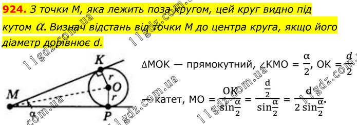 924. З точки М, яка лежить поза кругом, цей круг видно під кутом α. Визнач відстань від точки M до центра круга, якщо його діаметр дорівнює d. ∆MOK — прямокутний, ∠KMO = α/2, OK = d/2 — катет, MO = OK/(sin α/2) = (d/2)/(sin α/2) = d/(2 sin〖α/2〗 ).