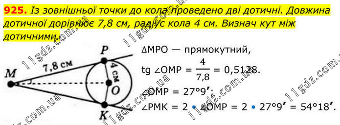 925. Із зовнішньої точки до кола проведено дві дотичні. Довжина дотичної дорівнює 7,8 см, радіус кола 4 см. Визнач кут між дотичними. ∆MPO — прямокутний, tg ∠OMP = 4/7,8 = 0,5128. ∠OMP = 27°9’; ∠PMK = 2 • ∠OMP = 2 • 27°9’ = 54°18’.