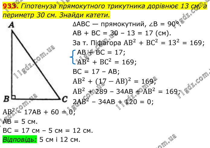 933. Гіпотенуза прямокутного трикутника дорівнює 13 см, а периметр 30 см. Знайди катети. ∆АВС — прямокутний, ∠B = 90°. АВ + ВС = 30 – 13 = 17 (см). За т. Піфагора 〖АВ〗^2 + 〖ВС〗^2 = 13^2 = 169; АВ + ВС = 17; 〖АВ〗^2 + 〖ВС〗^2 = 169; ВС = 17 – АВ; 〖АВ〗^2 + 〖(17-АВ)〗^2 = 169; 〖АВ〗^2 + 289 – 34АВ + 〖АВ〗^2 = 169; 2〖АВ〗^2 – 34АВ + 120 = 0; 〖АВ〗^2 – 17АВ + 60 = 0; АВ = 5 см. ВС = 17 см – 5 см = 12 см. Відповідь: 5 см і 12 см.