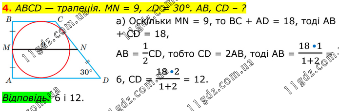 4. ABCD — трапеція. MN = 9, ∠D = 30°. AB, CD – ? а) Оскільки MN = 9, то BC + AD = 18, тоді AB + CD = 18, AB = 1/2CD, тобто CD = 2АВ, тоді АВ = (18 •1)/(1+2) = 6, CD = (18 •2)/(1+2) = 12. Відповідь: 6 і 12.