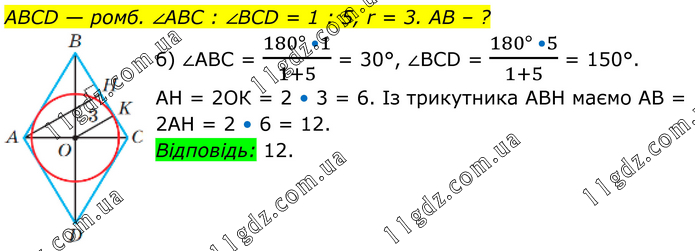 ABCD — ромб. ∠ABC : ∠BCD = 1 : 5, r = 3. AB – ? б) ∠ABC = (180° •1)/(1+5) = 30°, ∠BCD = (180° •5)/(1+5) = 150°. AH = 2OК = 2 • 3 = 6. Із трикутника ABH маємо AB = 2АН = 2 • 6 = 12. Відповідь: 12.