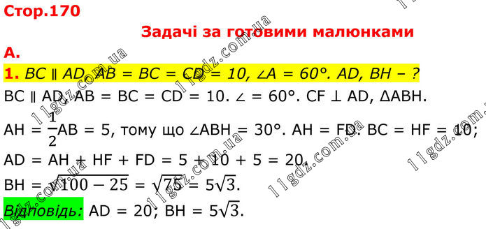 Задачі за готовими малюнками А. 1. BC ∥ AD, AB = BC = CD = 10, ∠A = 60°. AD, BH – ? BC ∥ AD, AB = BC = CD = 10. ∠ = 60°. CF ⊥ AD, ∆ABH. AH = 1/2АВ = 5, тому що ∠ABH = 30°. AH = FD. BC = HF = 10; AD = AH + HF + FD = 5 + 10 + 5 = 20. BH = √(100-25) = √75 = 5√3. Відповідь: AD = 20; BH = 5√3.