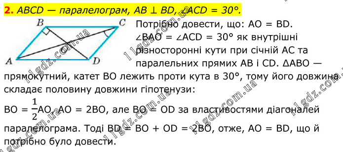 2. ABCD — паралелограм, AB ⊥ BD, ∠ACD = 30°. Потрібно довести, що: AO = BD. ∠BAO = ∠ACD = 30° як внутрішні різносторонні кути при січній AC та паралельних прямих AB і CD. ∆ABO — прямокутний, катет BO лежить проти кута в 30°, тому його довжина складає половину довжини гіпотенузи: BO = 1/2АО, AO = 2ВО, але BO = OD за властивостями діагоналей паралелограма. Тоді BD = BO + OD = 2ВО, отже, AO = BD, що й потрібно було довести.