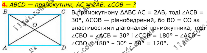 4. ABCD — прямокутник, AC = 2AB. ∠COB — ? В прямокутному ∆ABC AC = 2АВ, тоді ∠ACB = 30°, ∆СОВ — рівнобедрений, бо BO = CO за властивостями діагоналей прямокутника, тоді ∠CBO = ∠ACB = 30° і ∠COB = 180° – ∠ACB – ∠CBO = 180° – 30° – 30° = 120°.
