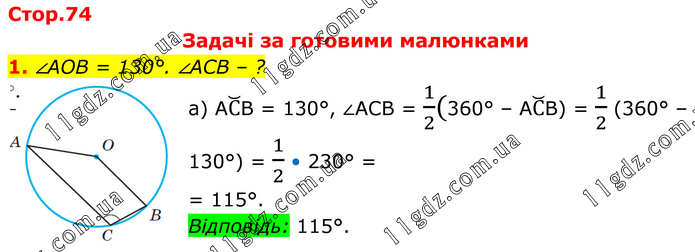 Задачі за готовими малюнками 1. ∠AOB = 130°. ∠ACB – ? a) AC ̆B = 130°, ∠ACB = 1/2(360° – АC ̆В) = 1/2 (360° – 130°) = 1/2 • 230° = = 115°. Відповідь: 115°.