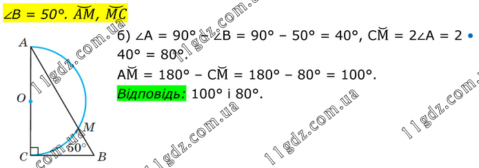 ∠B = 50°. (AM) ̆, (MC) ̆ б) ∠A = 90° – ∠B = 90° – 50° = 40°, CM ̆ = 2∠A = 2 • 40° = 80°. AM ̆ = 180° – CM ̆ = 180° – 80° = 100°. Відповідь: 100° і 80°.